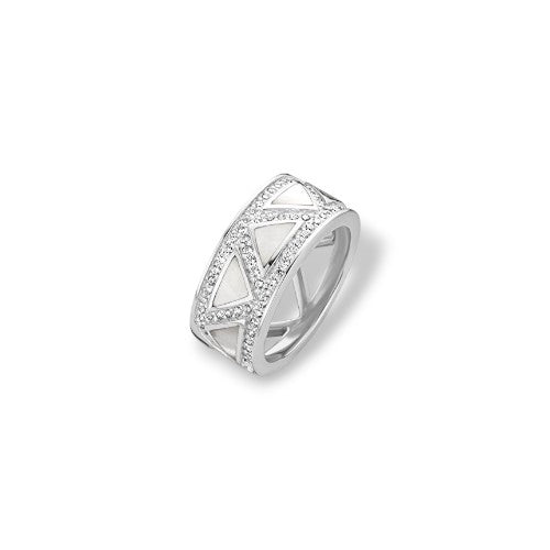 Questo stiloso anello della collezione TI SENTO – Milano è realizzato in argento sterling rodiato 925 e presenta una fila di zirconi e madreperla intagliata.