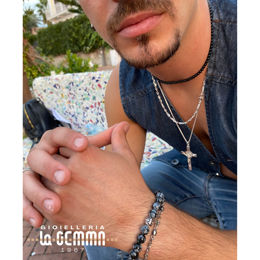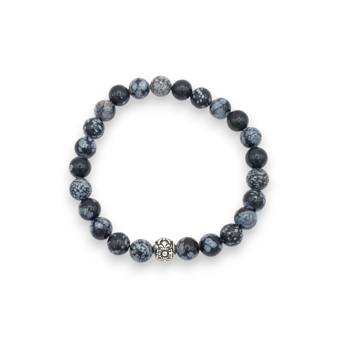Bracciale in pietre di Ossidiana fiocco di neve con bead centrale in argento 925.