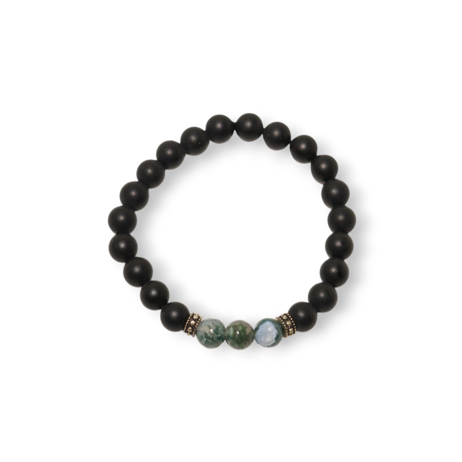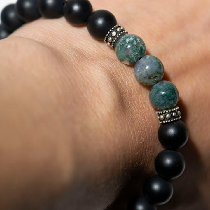Bracciale di Agata nera con tre pietre centrali di Agata muschiata e bead in argento 925.