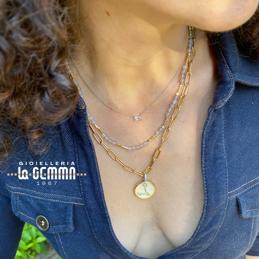 Presenta pietre di zirconia cubica incastonate a mano su una moneta di madreperla. Un pavé di pietre di zirconia cubica luminose decora anche l'anello a clip che consente di agganciare il ciondolo a qualsiasi collana.