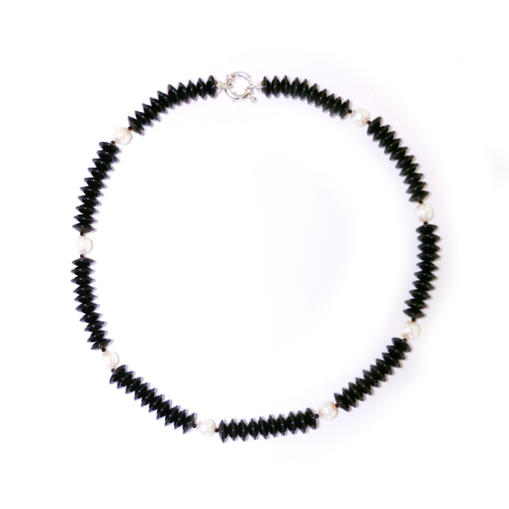 Collana in onice nero e perle naturali con chiusura in argento 925.