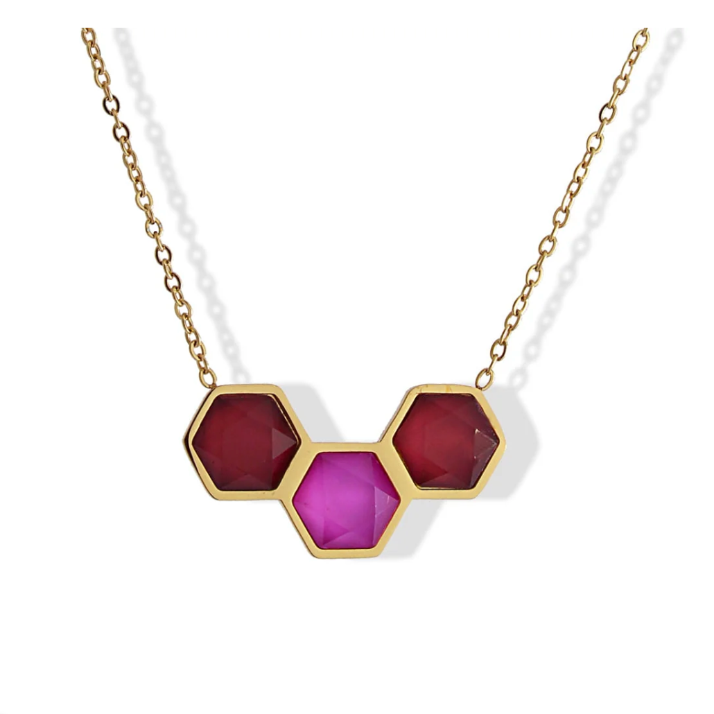 Collana in acciaio dorato con tre pietre geometriche centrali in resina colorata.