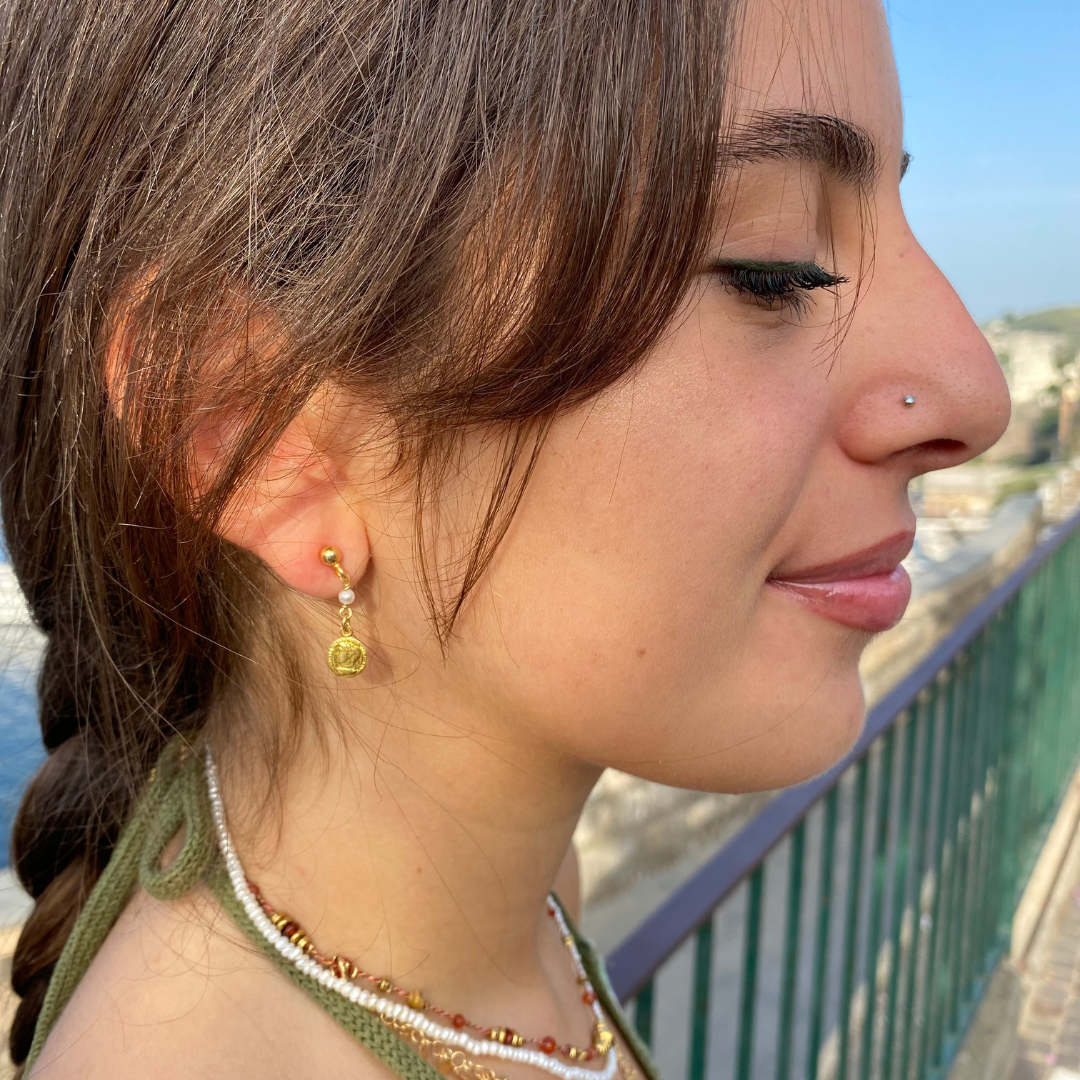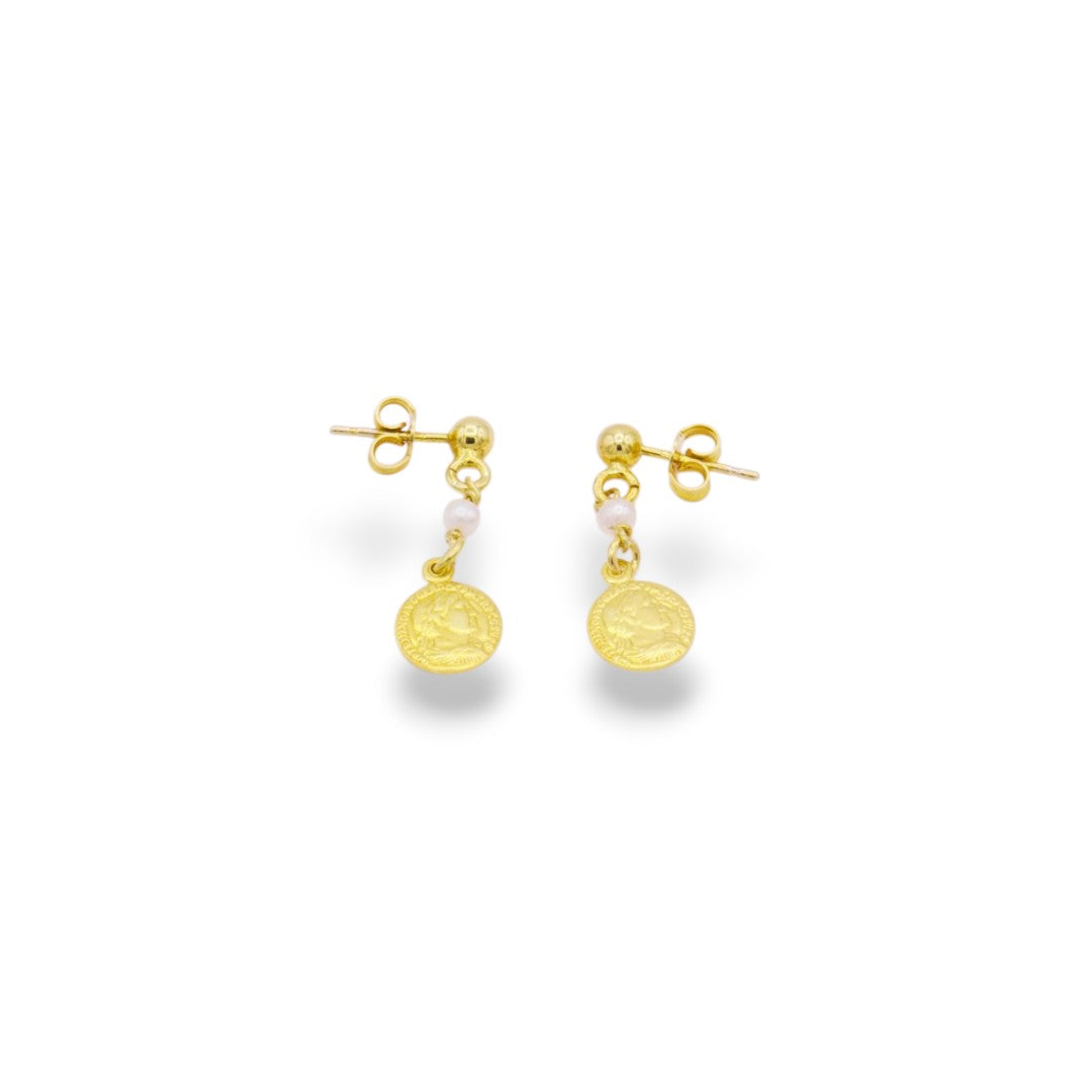 Presentano una piccola perla seguita da una moneta romana stilizzata sempre in argento 925 dorato.